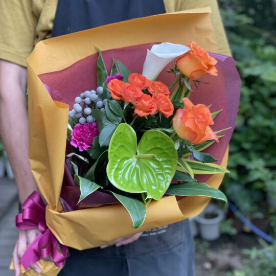 野バラの赤いアレンジメント 参考価格 | ¥5,500[税込み] 生き生きとした野バラの動きを活かし作成しました。 ピンクッション・ライスフラワー・ビバーナム・ピンク薔薇・アジサイなど ドライフラワーにもなる花材をふんだんに使用しております。