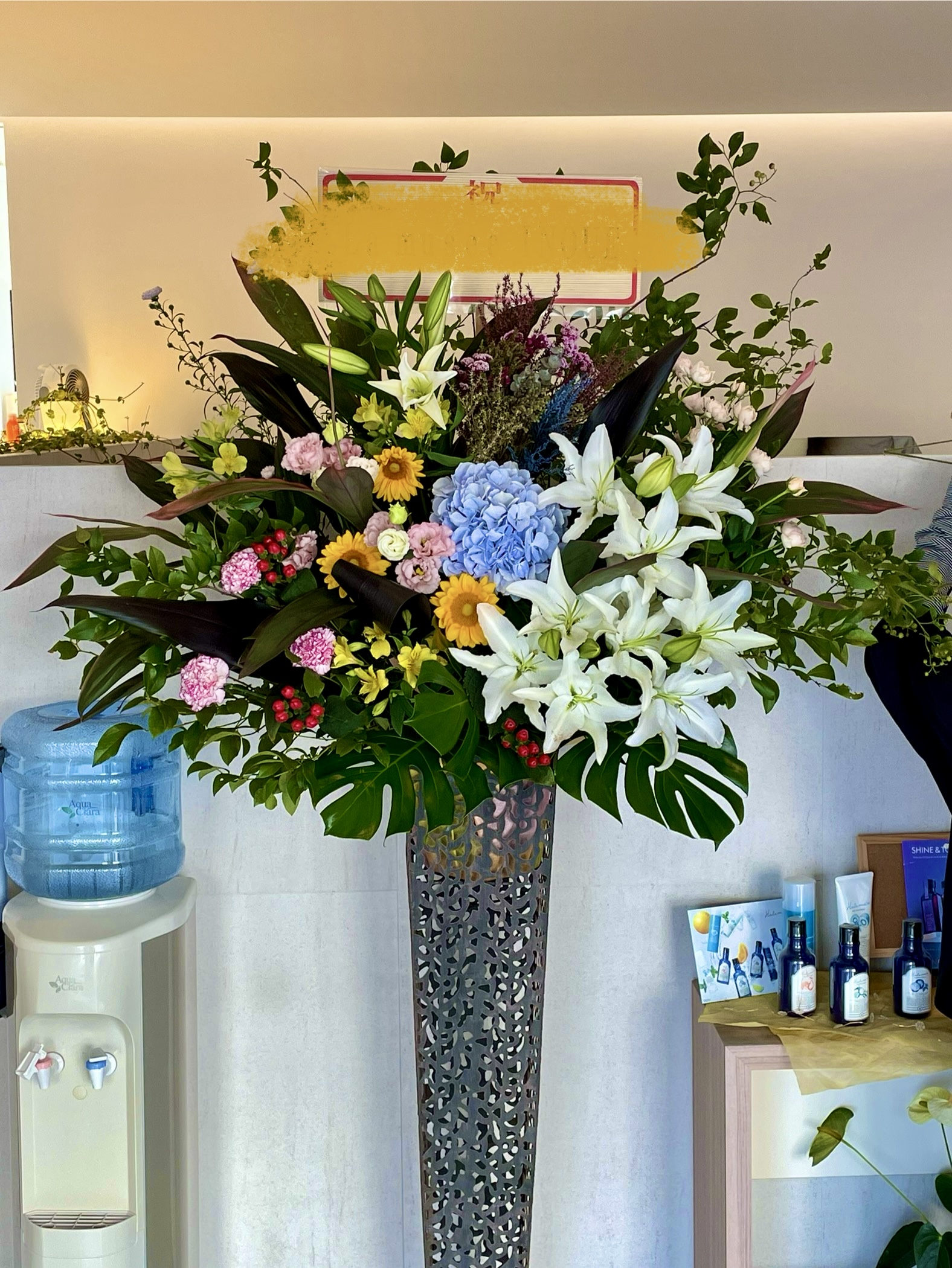 お祝スタンド花 ユリとアジサイとヒマワリ 参考価格 | ¥16,500[税込み] 葉物を沢山使用したお祝スタンドです。 お花は大輪のユリとアジサイとヒマワリをメインにインパクトを出しつつ涼しげに作成しました。