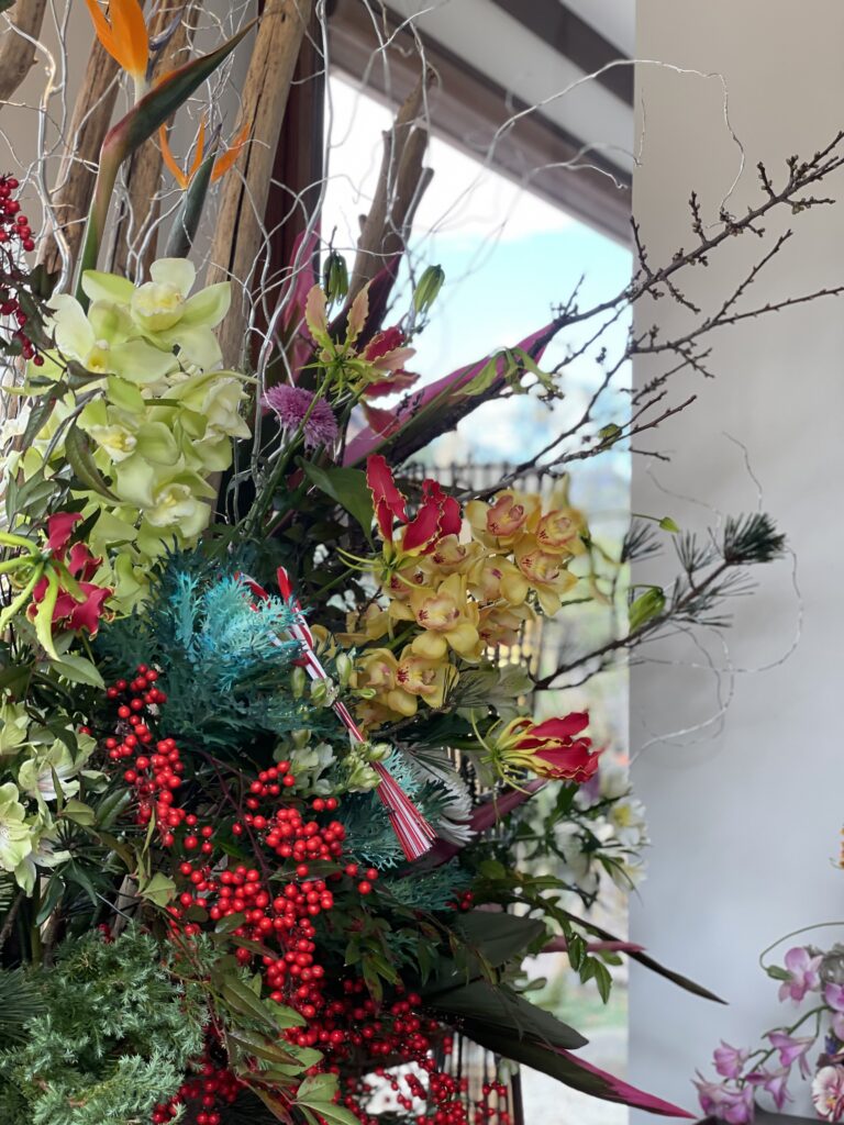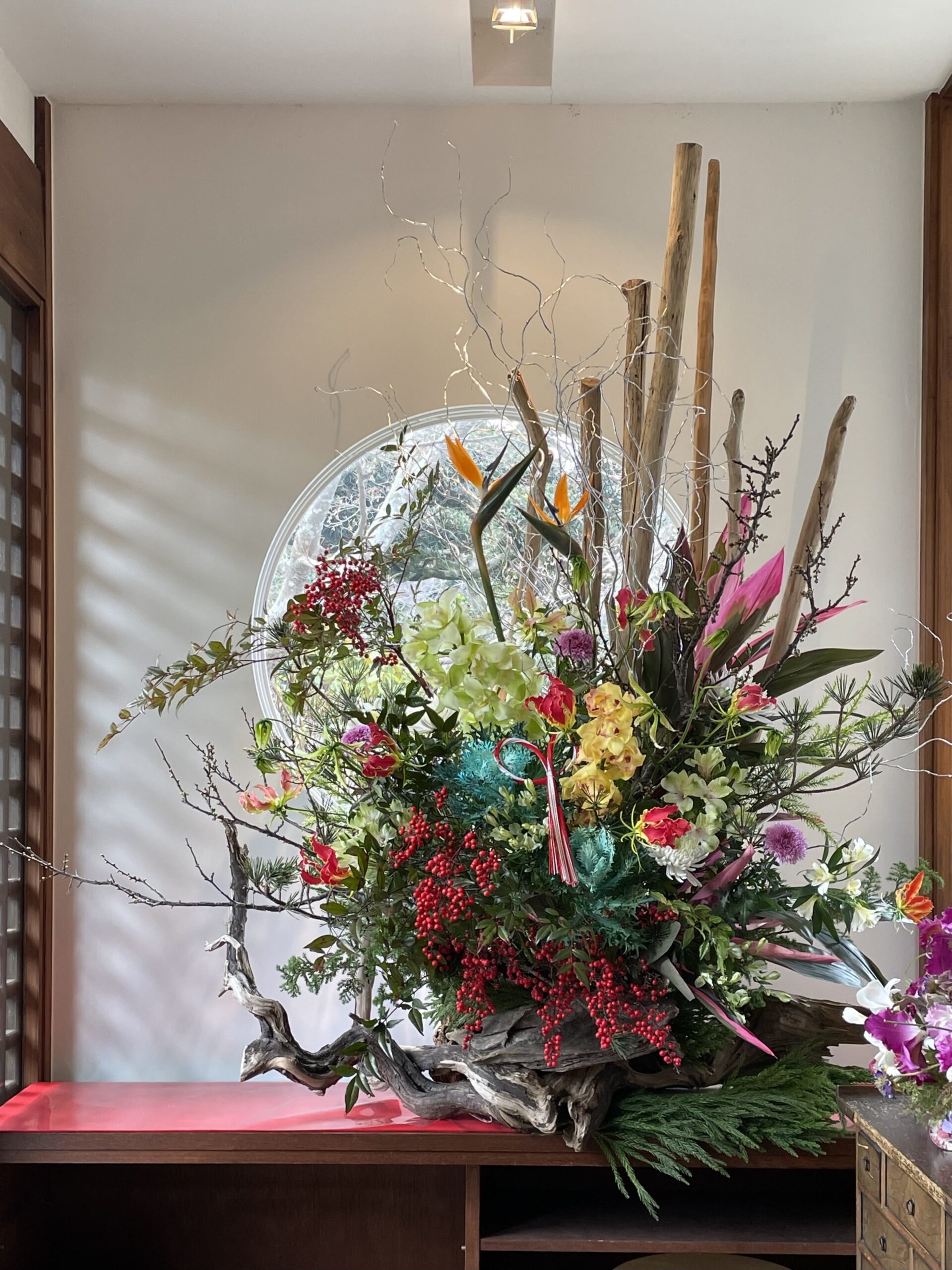 流木・松・梅・柳・南天・蘭・生花 などを取り合わせて華やかに、豪華に作成しました。